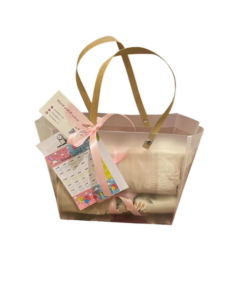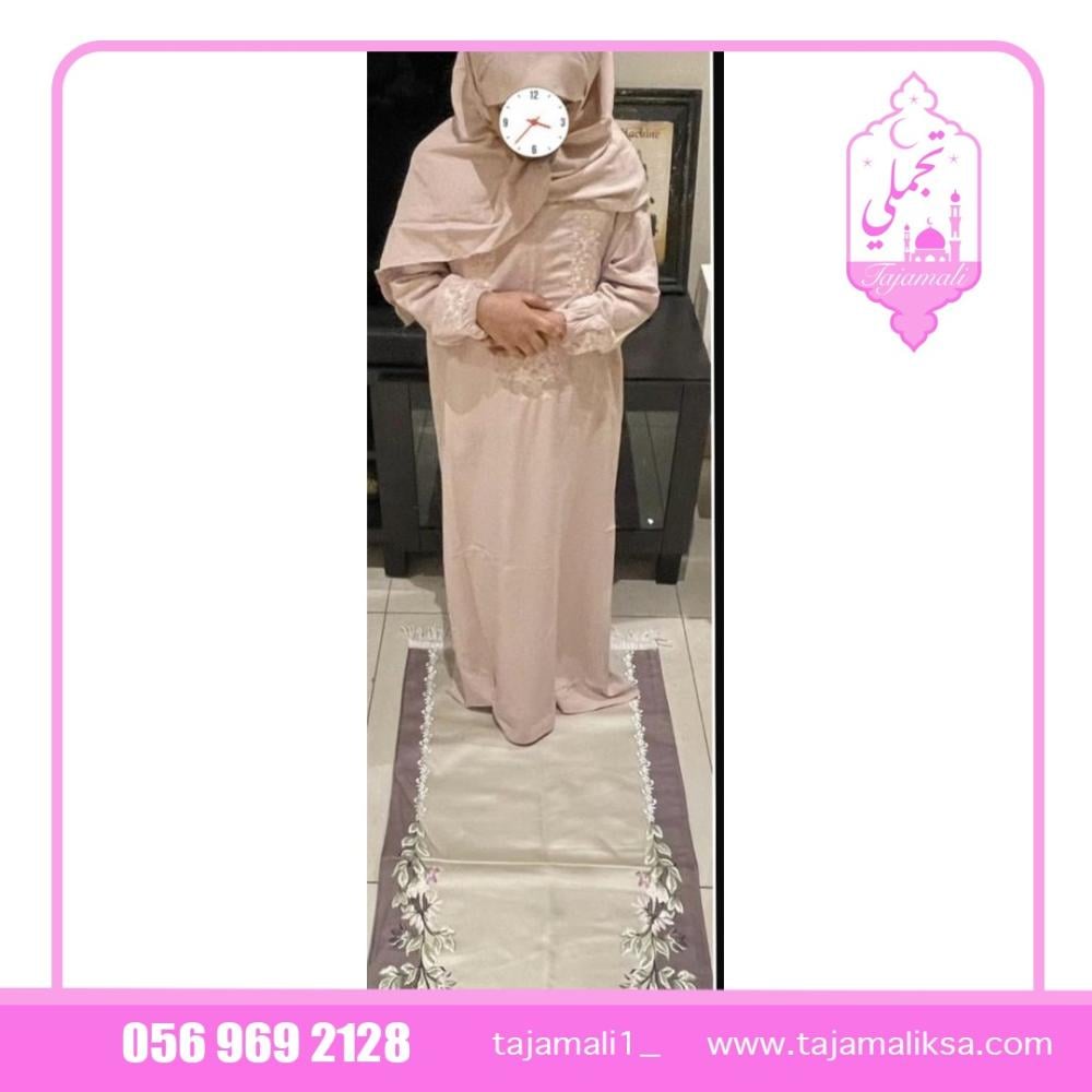 طقم بناتي أنيق يتكون من سجادة صلاة مزخرفة بتصميم جميل وألوان هادئة مع ثوب صلاة متناسق، مميز بتطريز ناعم يضفي لمسة من الجمال والفخامة.